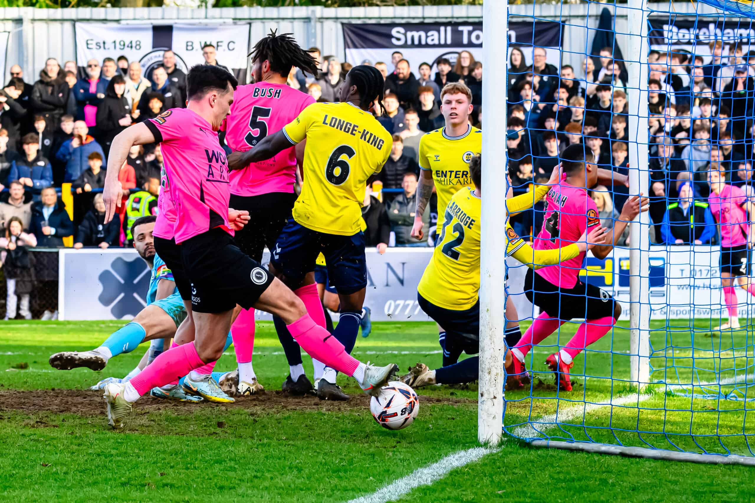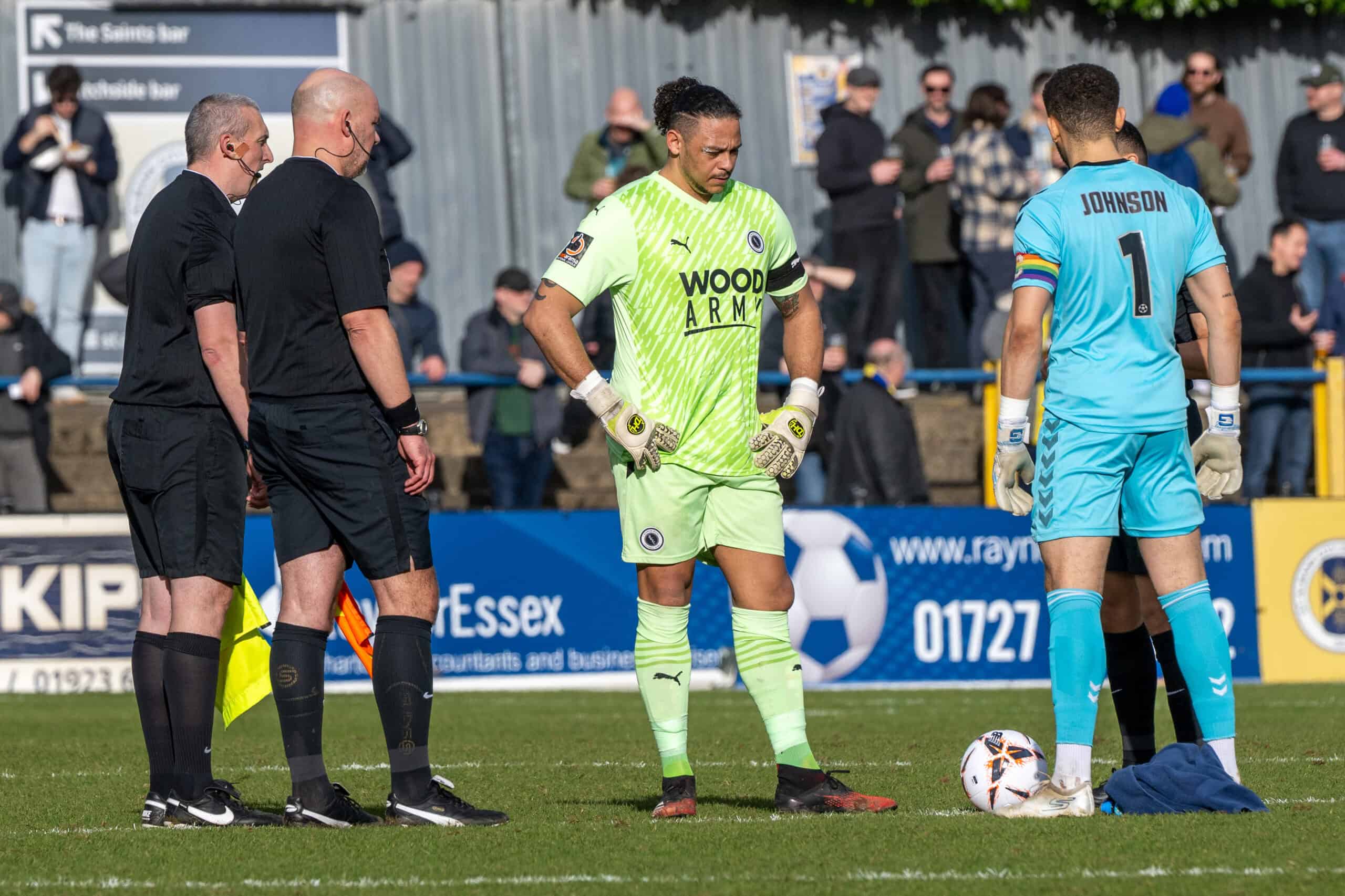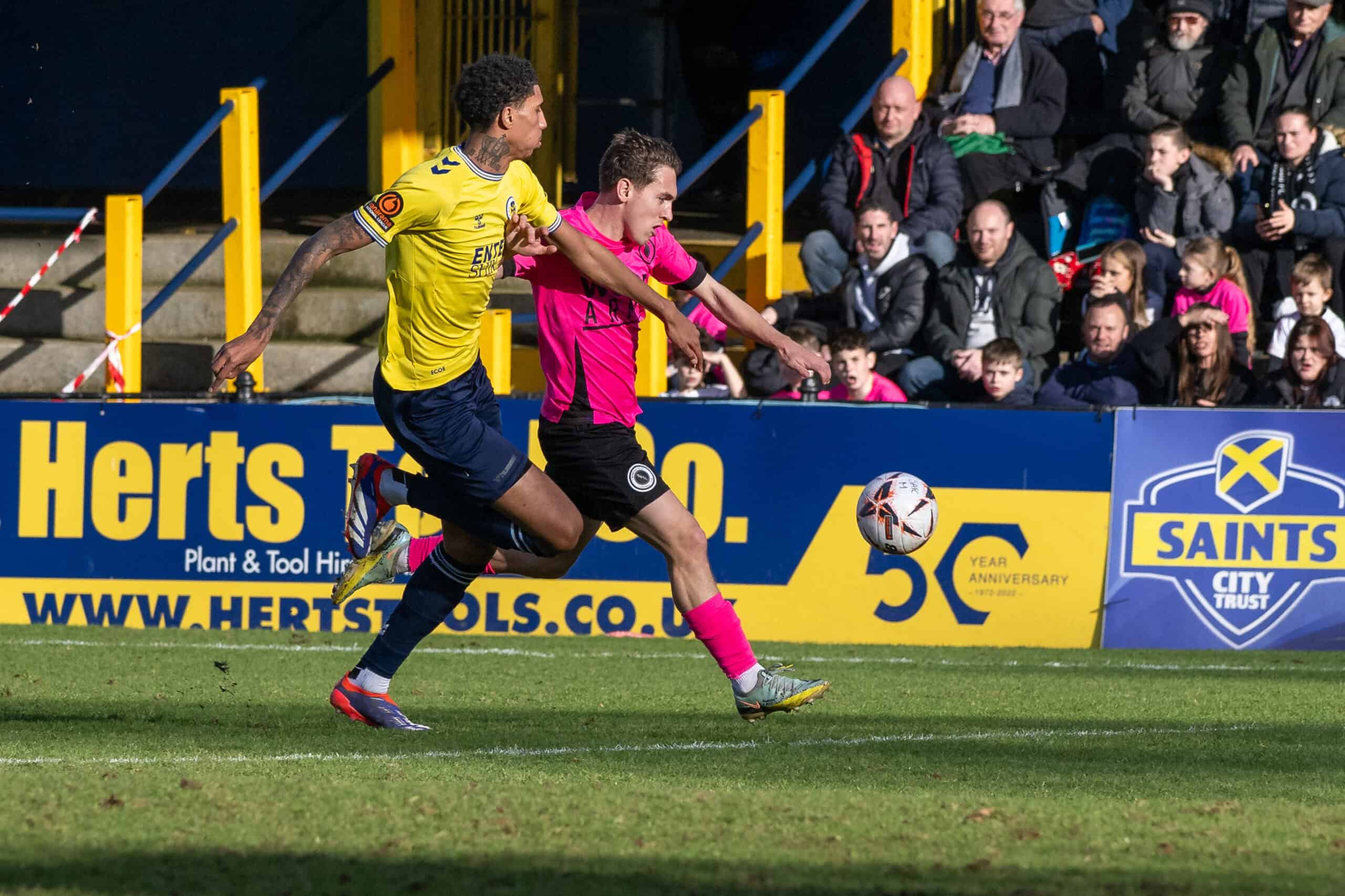 On 26 minutes, Brandon Mason went on a good run before firing narrowly wide for the hosts. A minute later, Femi Ilesanmi shot just wide for Boreham Wood. Just before the break, Wood took the lead against the run of play when a Whelan corner was spilt by Johnson in the Saints’ goal, enabling Charlie O’Connell to convert a simple tap-in at the far post.
