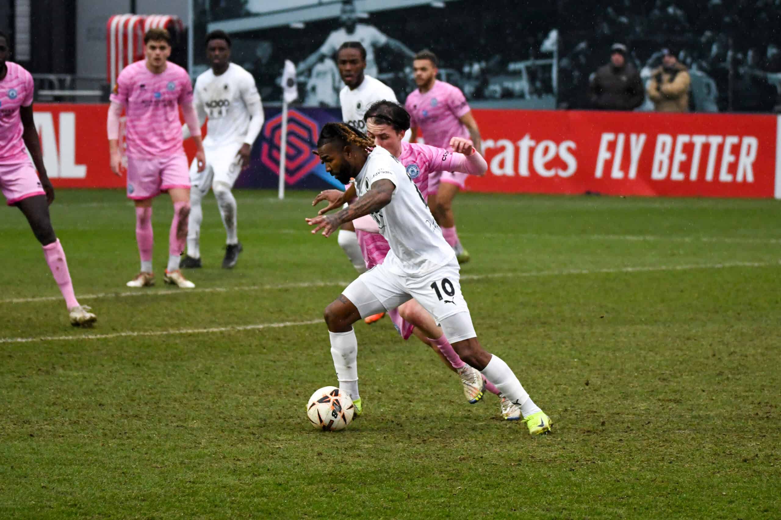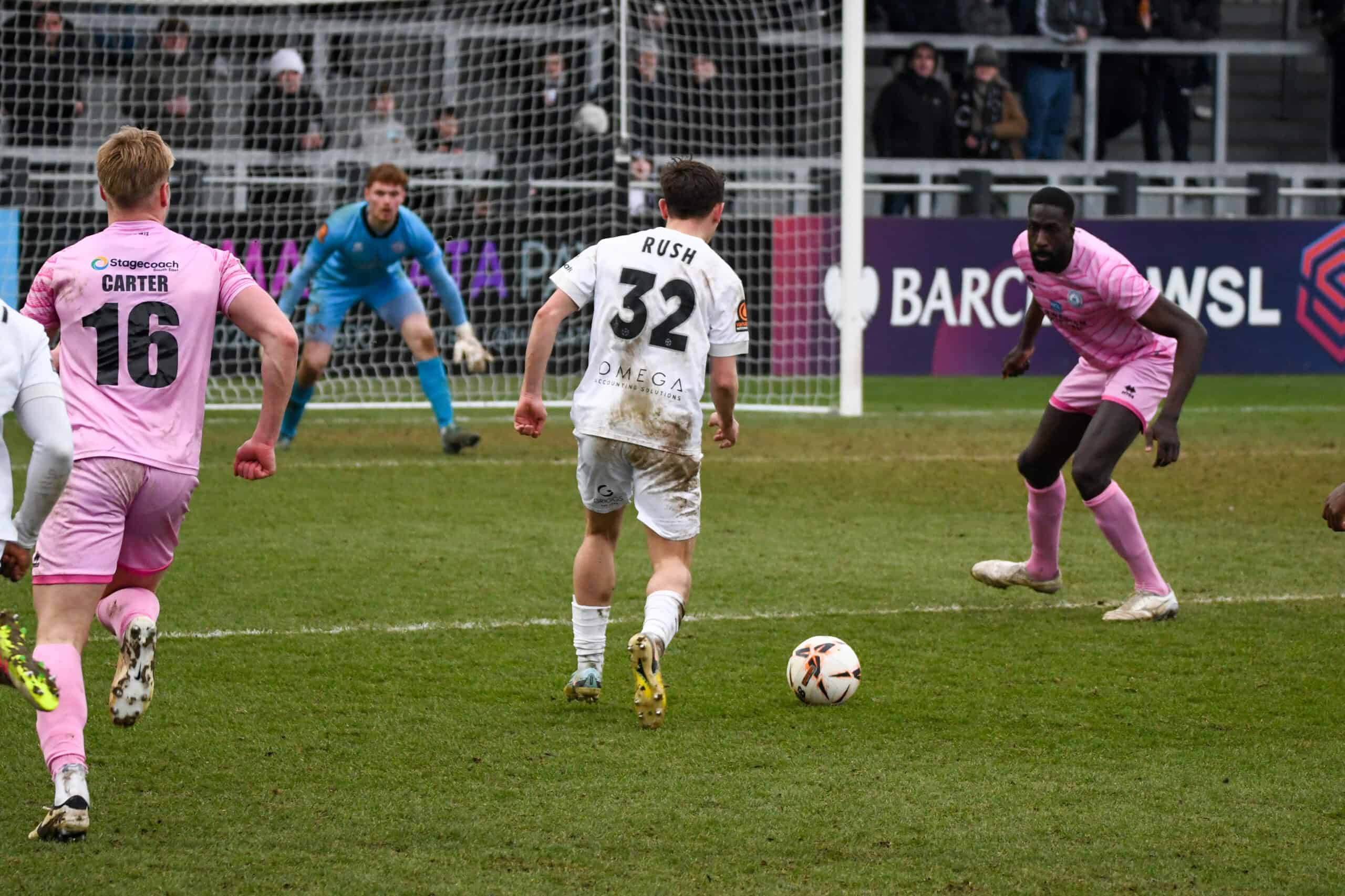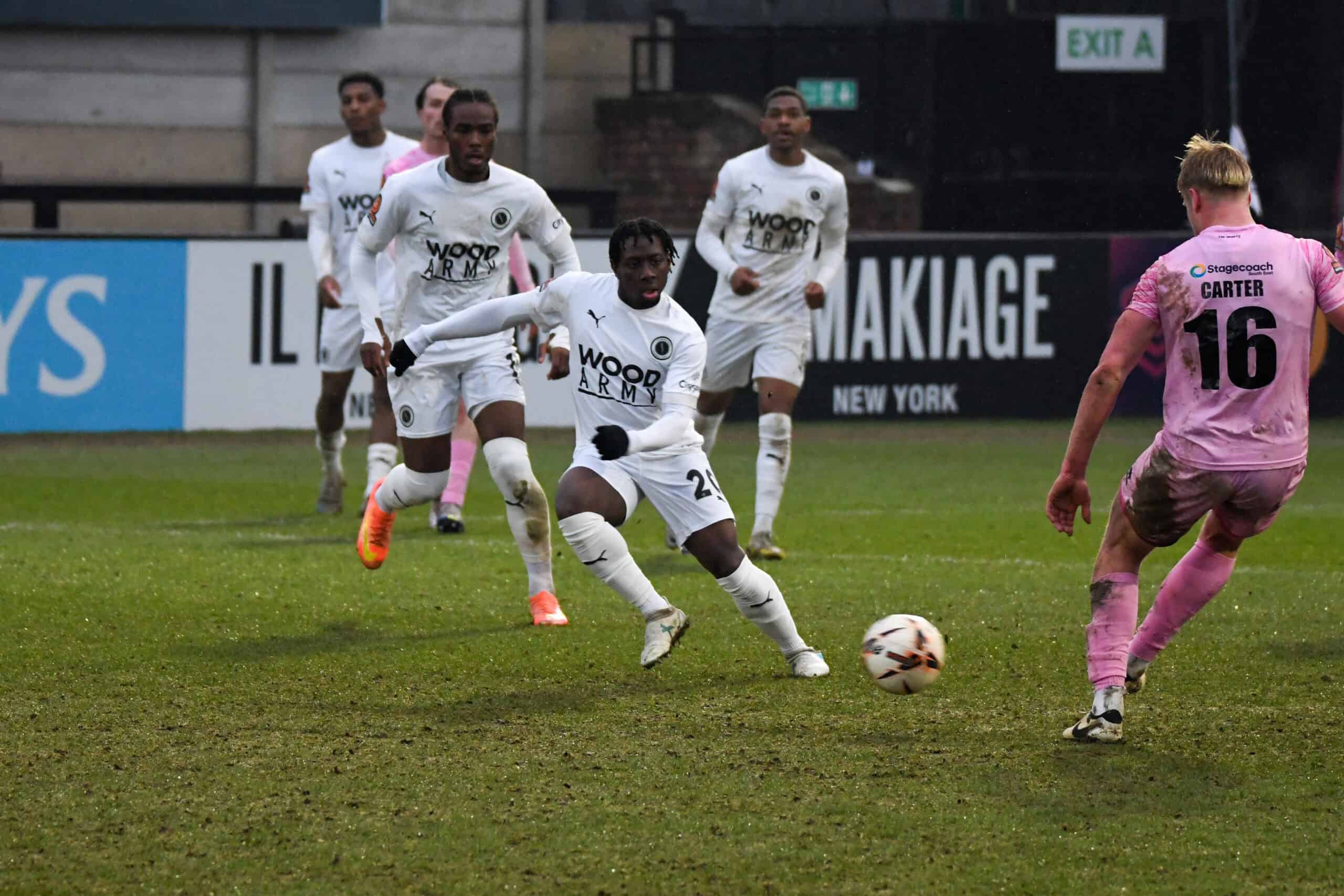 On 33 minutes, the Sports were awarded a penalty when Kwesi Appiah handballed it in the area. Alexander stepped up to take it, but Nathan Ashmore pulled off an outstanding save to deny him and keep the score level. This lifted Boreham Wood, who then went on to enjoy their best spell of the half and dominated the game thereafter. On 37 minutes, an excellent cross from Matt Rush would have been a tap-in for Appiah, but for an excellent interception from Kai Woollard-Innocent, which denied him. Three minutes later, some excellent interplay between Jon Benton and Appiah created a chance for Benton, whose shot was saved by the feet of Wright in the Sports goal. Despite nine corners and the lion’s share of possession for Eastbourne, Wood were able to come into the break level.