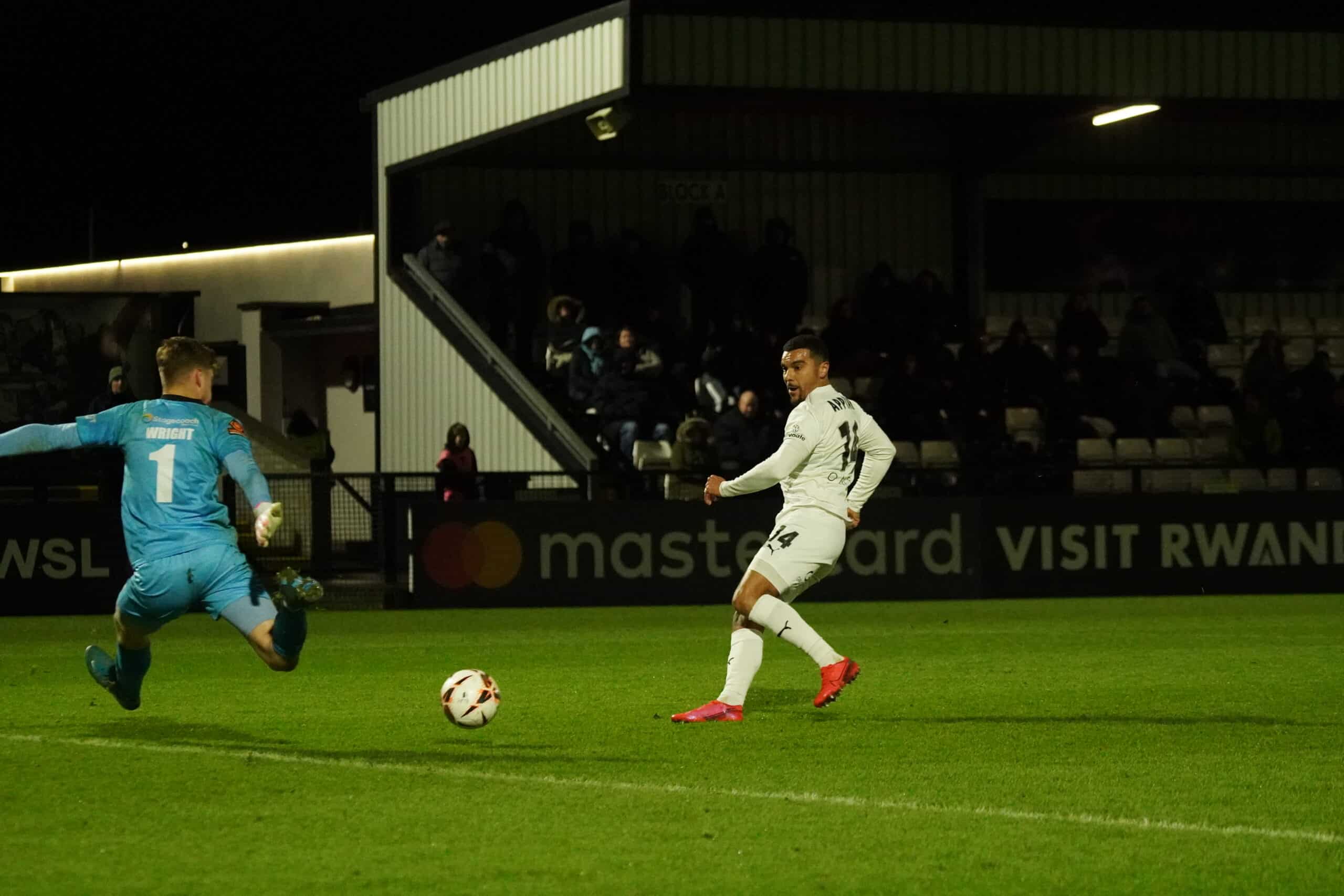 On 18 minutes, following a trademark Chris Bush throw-in, Marsh shot narrowly wide. The visitors then went up the other end, and Jayden Davis’s shot went well over the bar. Boreham Wood started to play some nice passing football over the next period of the match, but the only shot they had during that period was a Charlie O’Connell effort on thirty-two minutes, which Wright easily gathered.
