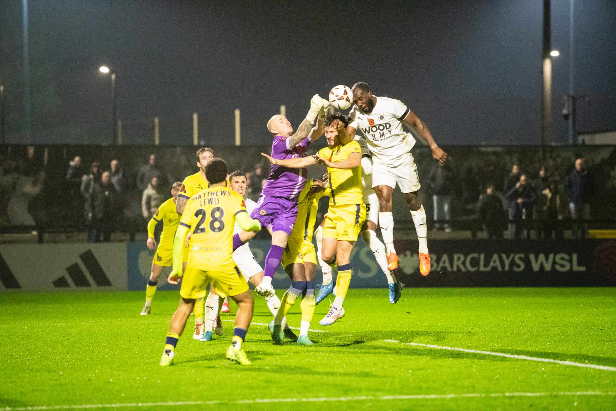 Shortly afterward, Gus Mafuta nearly restored Wood’s two-goal lead but fired just wide after a neat turn. After that chance, it was all Farnborough for the rest of the first half. On 23 minutes, Ashmore saved well from Millar Matthews-Lewis. Then Richard Chin had a shot deflected just wide before former Wood midfielder Aaron Kuhl fired just wide with the goal gaping. On 29 minutes, Clark forced Ashmore into a good save. The visitors could consider themselves unlucky not to have gone into the break level as Boreham Wood fought hard to maintain their lead.