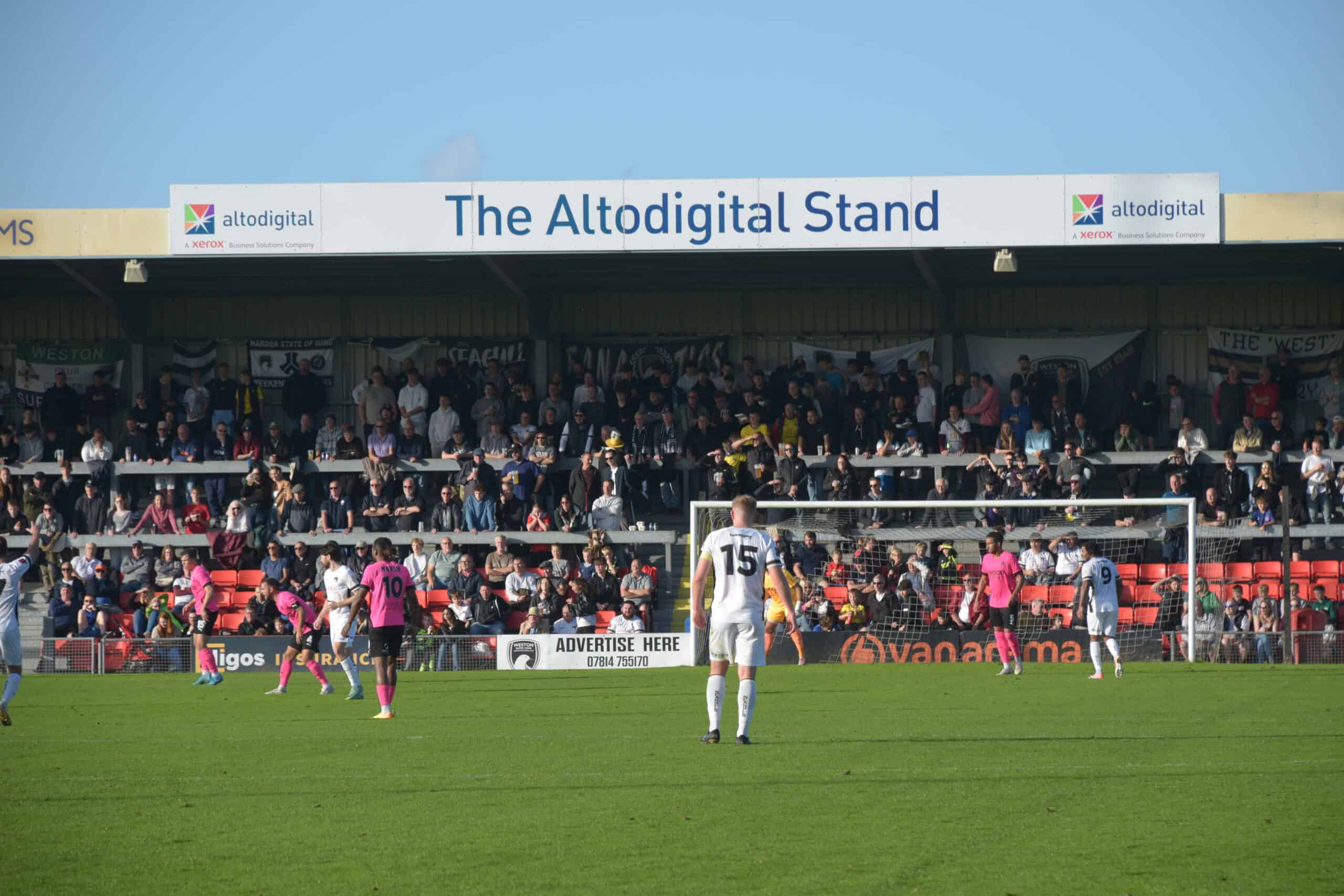 The game turned in Boreham Wood’s favour following an excellent Tom Whelan free-kick, which was somehow saved by Max Harris in the Weston goal on 69 minutes. From here on, Wood dominated proceedings and had chances to win it. A deflected shot from Whelan hit the crossbar. On 82 minutes, Whelan again went close but missed a good chance to give Wood the lead. In the closing stages, Erico Sousa went on an excellent run and, rather than shoot, he played the ball across the goal, just out of Appiah’s reach, but into the path of Jayden Richardson. However, he was neither able to get it under control before the ball was cleared.